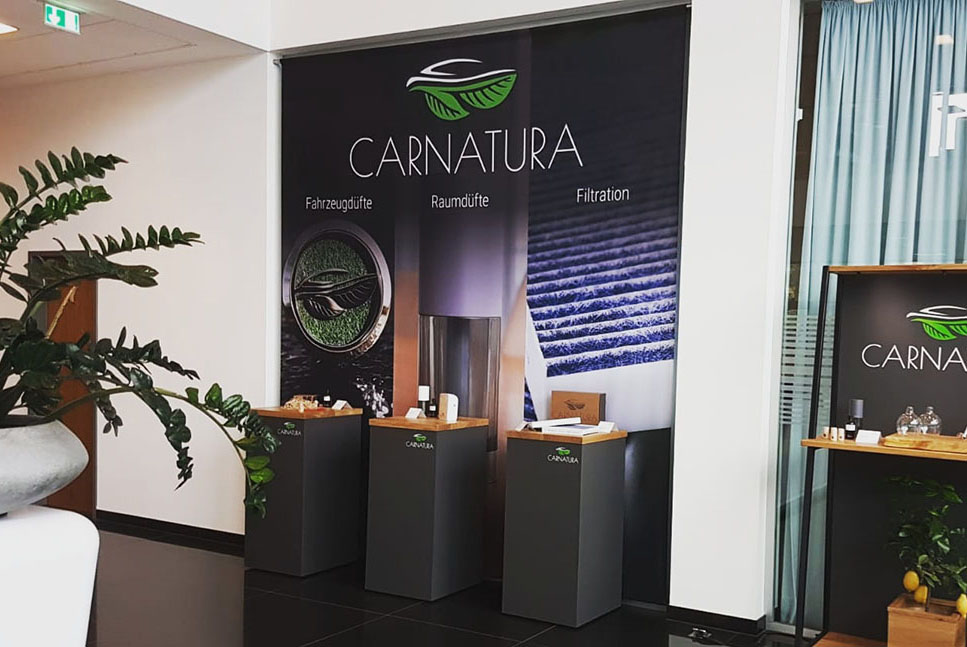Unser Samba-Textil (195 g/m²) kam beim gezeigten Wandbanner zum Einsatz – gespannt in einen rahmenlosen NoFrame-Spannrahmen mit Flachkeder. Ideal für Messewände, Showrooms und Verkaufsflächen. Unsere Smart Frames gibt es individuell auf Maß – auch mit integrierter LED-Hinterleuchtung und als Teil unseres MesseModulSystems.
