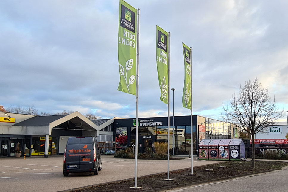 Fahnen gehören zu den beliebtesten Werbeträgern im Außenbereich. Sobald ein leichter Wind weht – und das ist bei uns fast immer der Fall – entfalten sie Ihre Werbebotschaft eindrucksvoll und weithin sichtbar.